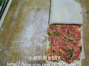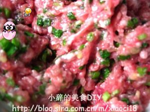 准备肉馅:姜碎,韭菜,盐,料酒,淀粉调均