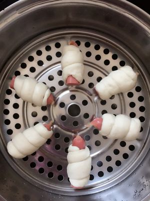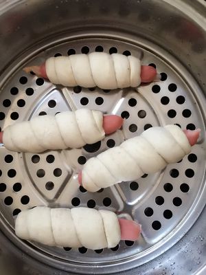 在篦子上摸一层油,然后把毛毛虫香肠卷放进去。记得是冷水开始,不要水沸了才把毛毛虫下锅。中火20-25分钟。关火不要开盖,五分钟后再开盖子。