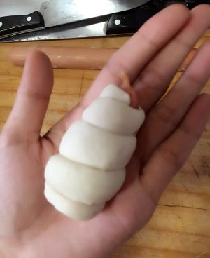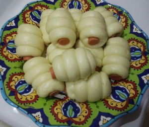 把醒好的面团揪成一个个小面团。然后用手搓成两头尖尖的条形。原谅我忘记拍长条面团的照片了,然后把长条从香肠的一短开始绕。
