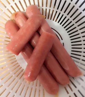 我用的是台湾烤肠的那种。大家喜欢吃别的样子的也可以自己更换。我家买的是大袋的冻在冰箱。拿出来化开,如图切成两段。