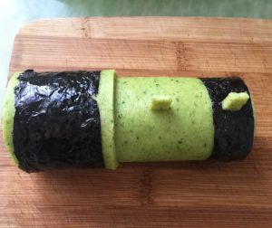 如图所示,装饰海苔,点缀上小烟囱,用芝士片切圆形做小火车的面部,再用海苔来做眼睛和嘴巴,再用西兰花饼切出小圆形面片做车轮