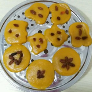 碟底抹一层花生油,以防饼底沾连。用枸杞子点缀,隔水蒸熟。
