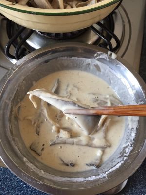 可以起油锅了,多倒些油要没过平菇,炸之前将平菇放面糊里裹匀,开始炸了,一定中火炸,不要着急哟!