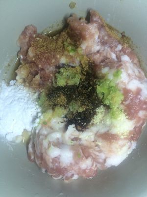 把猪肉馅与调料混合,顺一个方向搅打上劲。