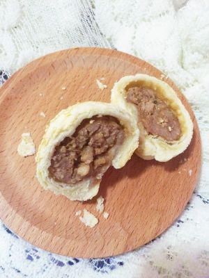烤好冷却后,取一个切开看看效果,层层开酥,酥得掉渣,肉馅也非常香!要是刚烤好就切,里面馅心看上去更诱人,还有汁水呢!