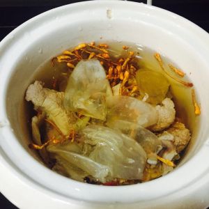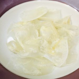 花胶先用温水浸泡4小时以上。Tips:买花胶首要有厚度,煲起不腥不潺和不溶化,食时粘滑爽口,才算极品,多数用来做菜。我这个只是一般品质更宜煲汤。