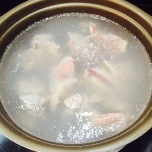 坐热水锅,放入龙骨汆烫去除血沫,捞起用冷水冲洗干净。