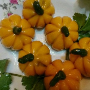 南瓜面团包入豆沙,揉成团,用牙签压出花纹,用拌入大麦青叶粉面团做瓜把成图