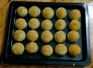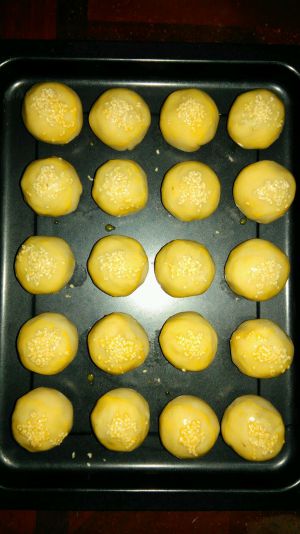 将包好的生胚整齐地放在烤盘上,刷上一层全蛋液,洒上白芝麻,若想颜色更好看,可只刷蛋黄液