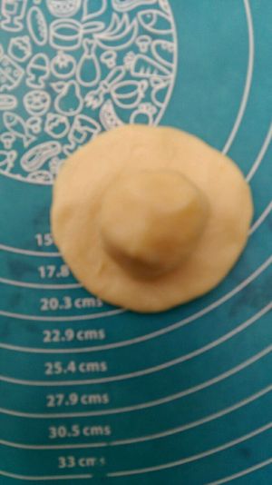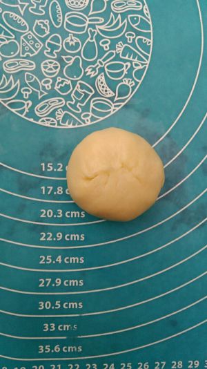 取一块擀好的面片,中间放入蛋黄豆沙馅,包好,捏紧收口,滚圆,收口朝下放置,其余面片同此操作
