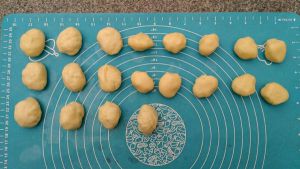 取约15克的红豆沙搓圆后按扁,放入半个咸蛋黄,然后包好搓圆,依次包好剩下的19个蛋黄豆沙馅