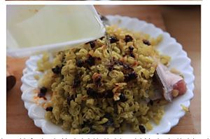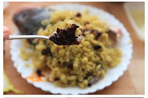 在鱼身淋上一汤匙料酒后,均匀的铺上泡椒碎;