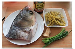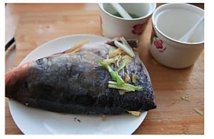 用适量盐将鱼头均匀的抹匀,并拍扁几片生姜和葱段一起抹在鱼身上腌制5分钟;