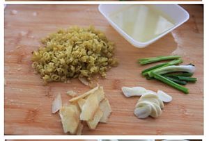 生姜切片,蒜切片,小米泡椒切碎(汁水倒入碗中备用);