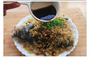 蒸好后取出挑去葱段姜片,倒入1碗鲜贝露调味汁,铺上一层葱花;