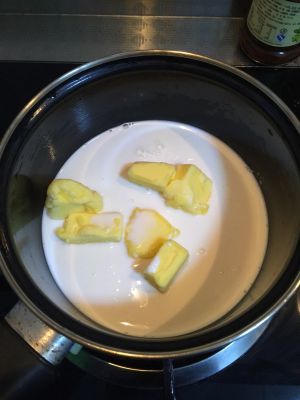 将黄油,牛奶,糖,盐放入锅内,小火熬制沸腾。
