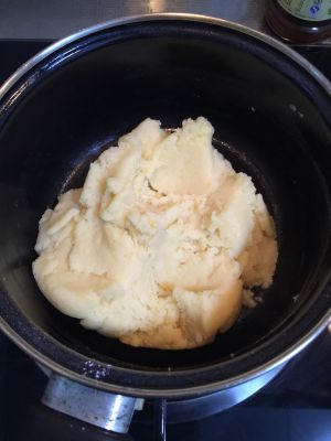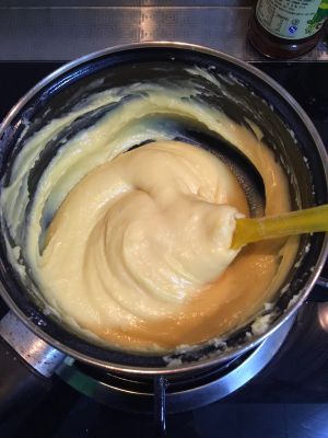 蛋液并不是必须要全都加进去,要根据面糊的干湿状态来决定。合适的面糊,是用筷子挑起面糊后可以成3cm--4cm的倒三角▽,如果不是,则面糊太干或太湿。这是泡芙成功与否的关键点之一。