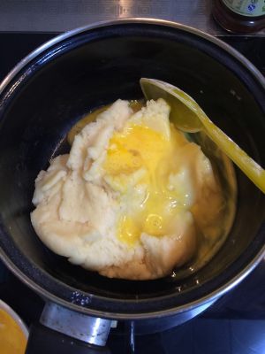 将搅拌好的全蛋液分多次加入到熟面糊中,每次加入后将蛋液和面糊充分搅拌均匀后再次加入蛋液。