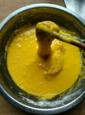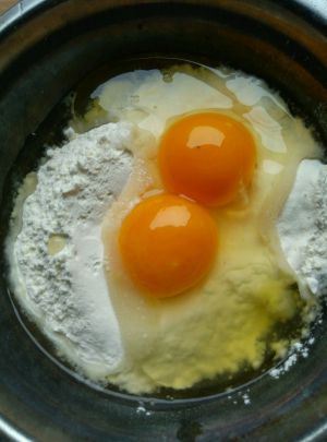 用碗放入100g面粉.2g盐.3个鸡蛋搅伴均匀。