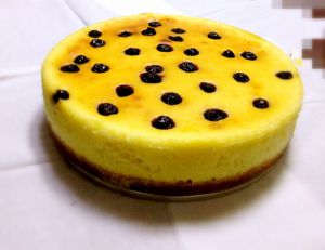 取出冰箱中的蛋糕底 把蛋糕糊倒入 点缀蓝莓干