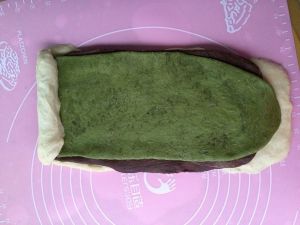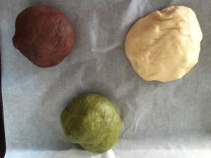 揉成三个颜色的面团,盖上保鲜膜开始第一次发酵。天气冷可以借助烤箱发酵60分钟左右。