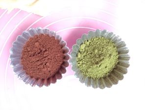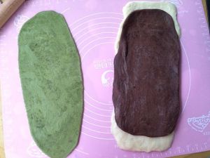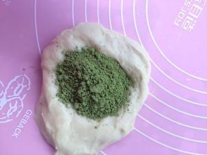 和面结束后将面团平均分成三等份。一份加入抹茶粉揉均匀,一份加入可可粉同样揉均匀,一份不加任何材料