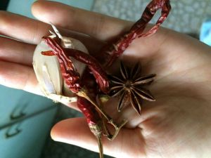 把蒜头拍烂,辣椒剥开,八角放进卤水里。这些香料可以不放,因为啤酒本身就有自己的香味,但是我是重口味,所以还是放了。