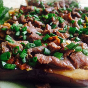 炒好的牛肉粒铺茄子上,洒上葱花,继续大火热八分钟