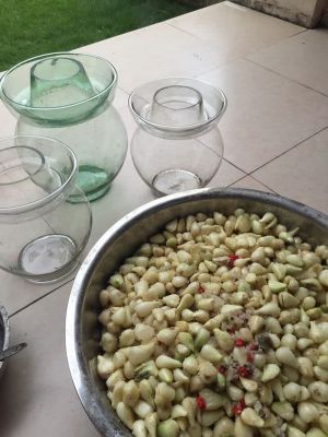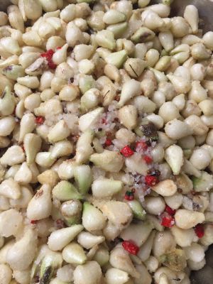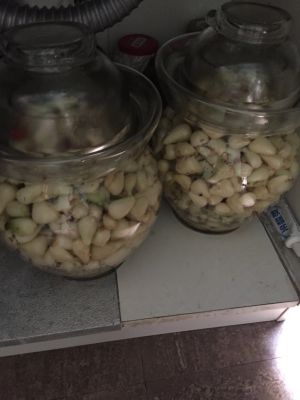 5、 将拌好的藠头放入有衣塔水的腌缸(即缸口旁可加水的坛子)即可。