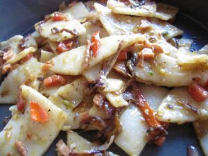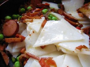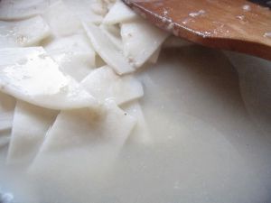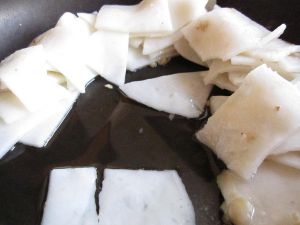 将煮好的饵块放入煎锅的冷油中翻面,两面沾油,这一步可以让之后的饵块片片分开,每片入味。