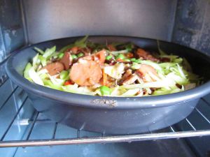 将13中翻炒好的大救驾放入烤盘中,撒一点切好的黄油丝。