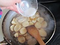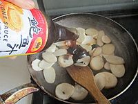 待杏鲍菇表面煎至微微发黄时, 加入鲍鱼汁, 生抽和少量的水;