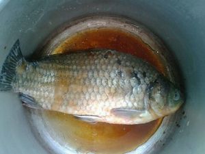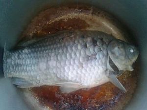 高压锅垫一层薄油,放入鱼,鱼淋上酱油,再淋点食用油