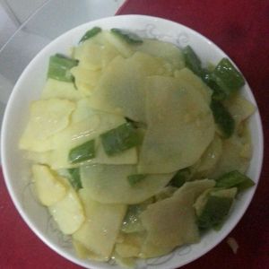 接下来我们来炒了,把油贱好,把土豆片放下去青椒放下去,翻炒,就好了,最后把盐味精放好就好了。是不是超级简单。没办法,我就这点本事。