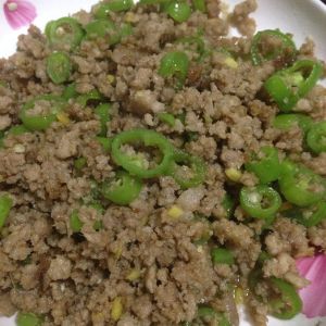 准备好材料后,锅里到上油七八成热,倒入猪肉末、姜末,翻炒过程撒些生抽,7、8成熟时,倒青椒,准备盛盘时加稍许盐调味。OK