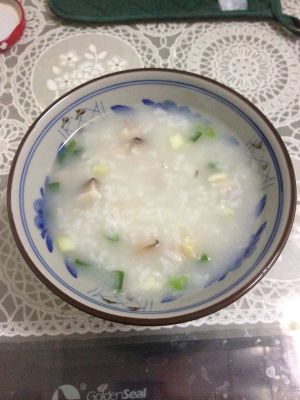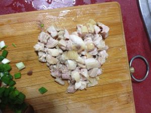 水开放入香菇丁和鸡丁,快煮好时放入葱。