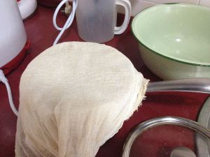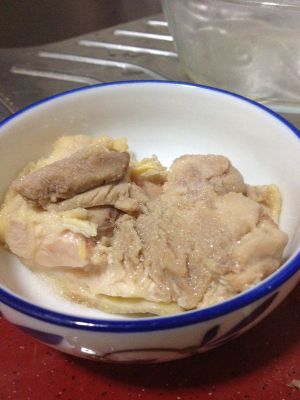 鸡腿肉去骨,在用刚才的高汤煮熟,再用盐腌120分钟