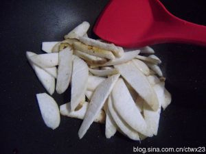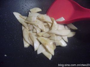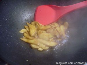 余油入杏鲍菇片煸炒(如果油不够,也可以再添一些油)