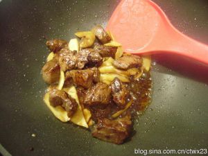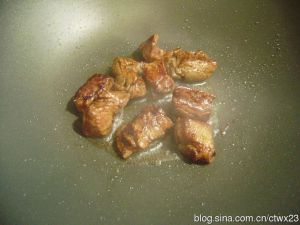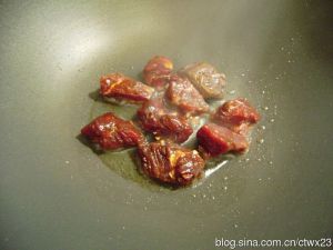 锅上火加热,入适量油,油热后逐块加入牛柳粒煎