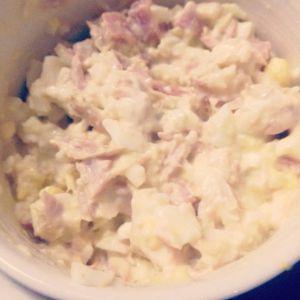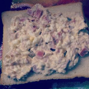 把鸡蛋弄碎'和火腿金枪鱼一起拌入奶酪和沙拉酱'份量自己随意'喜欢可以多加一些