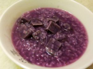 半杯大米淘洗几遍,和紫薯块一起放电饭煲中,加冷水到"稀饭1"的水位,按稀饭键煮熟后保温5-10分钟,开盖,加小半勺盐(加点盐可以缓解吃紫薯容易胀气的毛病,紫薯的甜味也会更鲜),均匀搅拌即可盛出(爱吃甜的也可以加几块冰糖一起熬)。