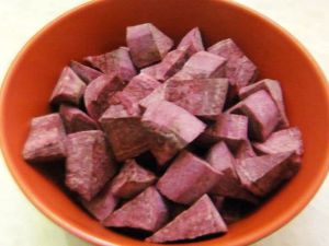 紫薯去皮洗净,如图切成小块(放电饭煲煮要尽量切小块些,如果放高压锅煮则尽量切大块些)。