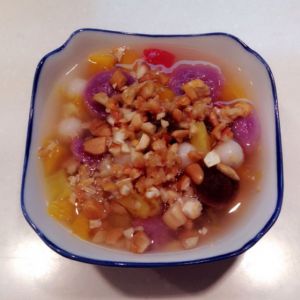 煮制汤圆的配料:干桂圆、橙子、葡萄干、菠萝、芒果、蜜枣粒、花生及腰果粒