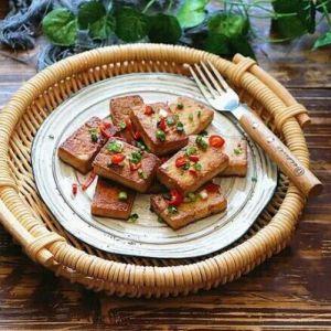 选择不粘锅,锅入倒入少许油,加热一会,再把老豆腐放入锅内。