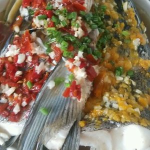 大火15分钟,关火虚蒸5分钟。时间看鱼头大小调整。撒葱花,浇热油,出锅!