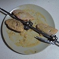 从鸡翅两根骨头中间的切口串入烤叉中(这样固定不易在滚动时掉出来)