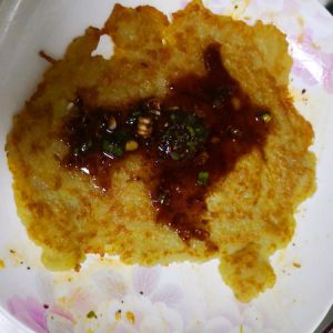 倒油,等油开将土豆泥放入锅中,小火,把土豆泥用大勺底圆圆的部分摊薄,方便土豆饼熟