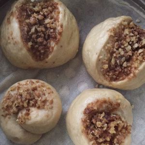 入锅蒸前,在馒头上切一刀口,用手把裂口掰大点倒上准备好的核桃料,入锅大火煮开小火蒸15钟,再焖5分钟开盖就可以美美的享用了。