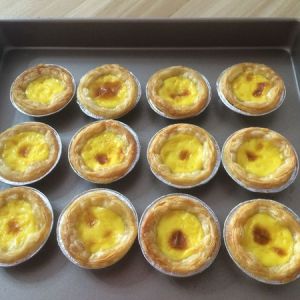 买现成最小尺寸的那种蛋挞皮(以下制作的蛋挞水可烤24个,我分两次烤的所以图中一盘是12个),提前化冻至室温。