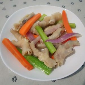 鸡爪切开,要入味斜切面大一点。洋葱切丝,胡萝卜、西芹切段,柠檬、姜切片。
